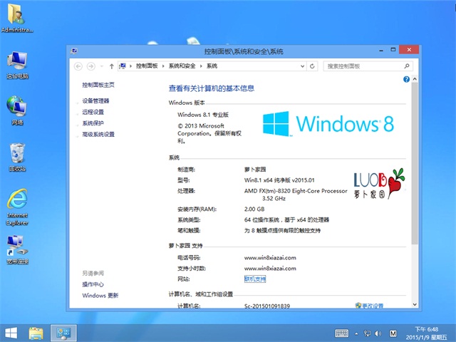 新萝卜家园 Ghost Win8.1 x64 纯净版 v2015.01分享给大家,新萝卜家园团队致力于管理技术的研发和操作系统的维护,以及快速部署等技术深受广大用户的好评。深度技术WIN8正式版具有免激活、一键快速安装、系统运行稳定等特点,重新为大家集成了“开始菜单”和“右键关机”功能,不再为找不到开始菜单和关机功能而烦恼!并在我的电脑右键加入了设备管理器、服务、控制面板等功能,方便用户使用,独创全新的系统双恢复模式,解决了某些SATA光驱和有隐藏分区的电脑不能正常安装系统的问题,欢迎大家下载使用!