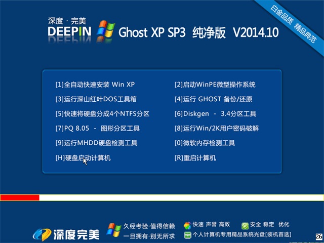 * 源安装盘采用Windows XP SP3官方免激活版,集成系统补丁至2014.10(可通过微软漏洞扫描)