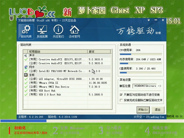 * 安装过程会运行自主开发的驱动选择工具,此工具可智能判断所有的电脑硬件型号,最大限度地避免了因驱动冲突而蓝屏的现象。