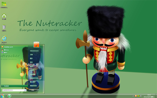 胡桃夹子玩偶是一个穿着制服,拿着斧头的士兵,很多人小时候都玩过这个玩具吧,今天小编就特别为大家奉上这款带有童年记忆的胡桃夹子玩偶士兵W8主题哦,这款主题是浅绿色的背景下,一个玩偶士兵在站岗的情景哦,看着他立正的姿势,真替他累啊~不过这款玩偶士兵还是很可爱的说,是不是呢?喜欢的话,赶紧把他打包带走吧。